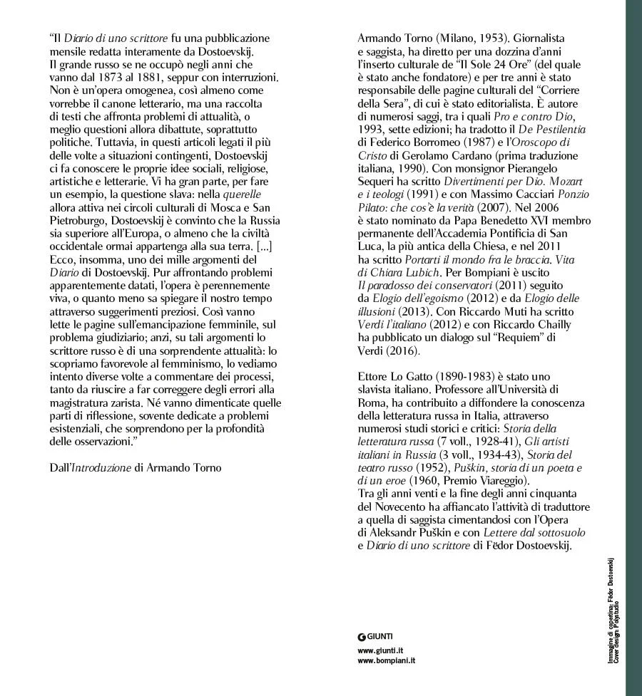 ''Il 'Diario di uno scrittore' fu una pubblicazione mensile redatta interamente da Dostoevskij. Il grande russo se ne occupò negli anni che vanno dal 1873 al 1881, seppur con interruzioni. Non è un'opera omogenea, così almeno come vorrebbe il canone letterario, ma una raccolta di testi che affronta problemi di attualità, o meglio questioni allora dibattute, soprattutto politiche. Tuttavia, in questi articoli legati il più delle volte a situazioni contingenti, Dostoevskij ci fa conoscere le proprie idee sociali, religiose, artistiche e letterarie. Vi ha gran parte, per fare un esempio, la questione slava: nella querelle allora attiva nei circoli culturali di Mosca e San Pietroburgo, Dostoevskij è convinto che la Russia sia superiore all'Europa, o almeno che la civiltà occidentale ormai appartenga alla sua terra. (...) Ecco, insomma, uno dei mille argomenti del 'Diario' di Dostoevskij. Pur affrontando problemi apparentemente datati, l'opera è perennemente viva, o quanto meno sa spiegare il nostro tempo attraverso suggerimenti preziosi. Così vanno lette le pagine sull'emancipazione femminile, sul problema giudiziario; anzi, su tali argomenti lo scrittore russo è di una sorprendente attualità: lo scopriamo favorevole al femminismo, lo vediamo intento diverse volte a commentare dei processi, tanto da riuscire a far correggere degli errori alla magistratura zarista. Né vanno dimenticate quelle parti di riflessione, sovente dedicate a problemi esistenziali, che sorprendono per la profondità delle osservazioni.'' (Dall'''Introduzione'' di Armando Torno)