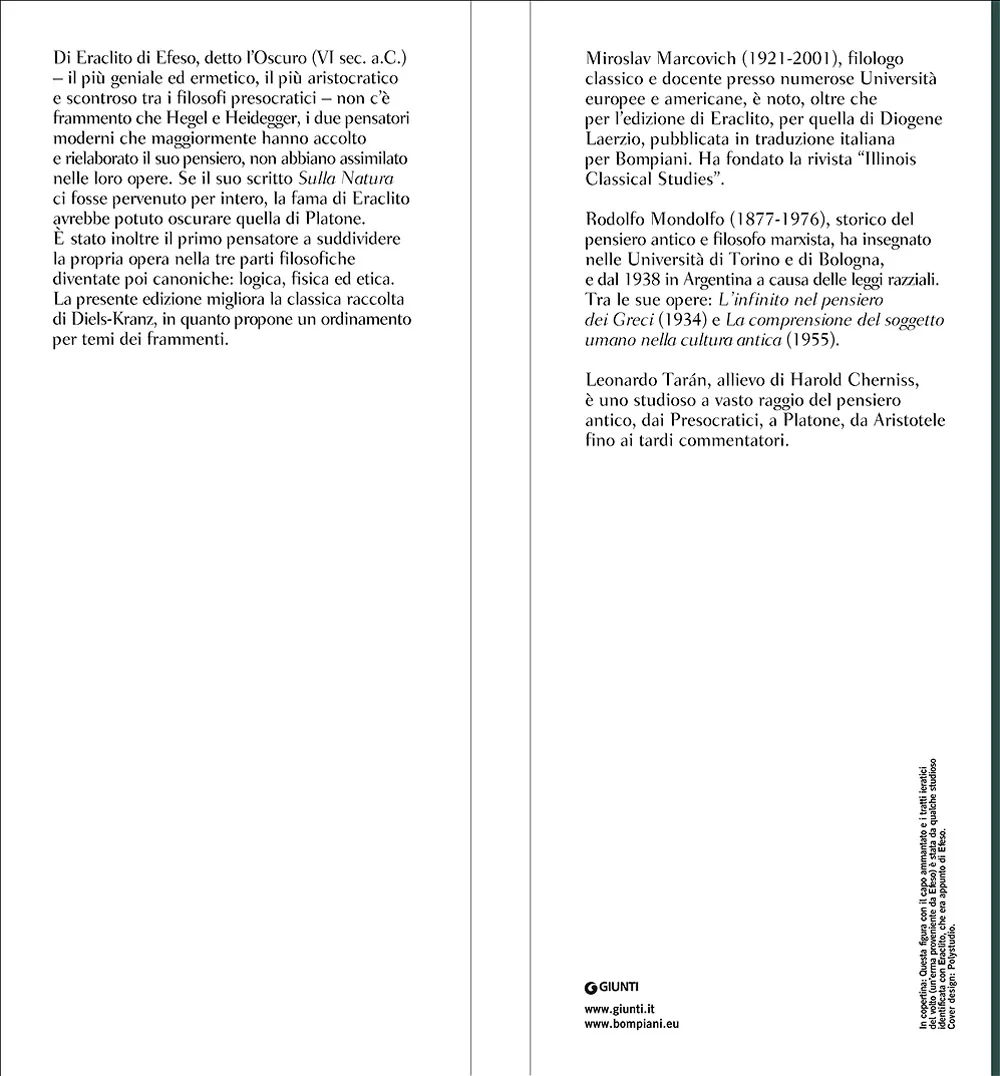 Di Eraclito di Efeso, detto l'Oscuro (VI sec. a.C.) - il più geniale ed ermetico, il più aristocratico e scontroso tra i filosofi presocratici - non c'è frammento che Hegel e Heidegger, i due pensatori moderni che maggiormente hanno accolto e rielaborato il suo pensiero, non abbiano assimilato nelle loro opere. Se il suo scritto ''Sulla Natura'' ci fosse pervenuto per intero, la fama di Eraclito avrebbe potuto oscurare quella di Platone. E' stato inoltre il primo pensatore a suddividere la propria opera nella tre parti filosofiche diventate poi canoniche: logica, fisica ed etica. La presente edizione migliora la classica raccolta di Diels-Kranz, in quanto propone un ordinamento per temi dei frammenti.