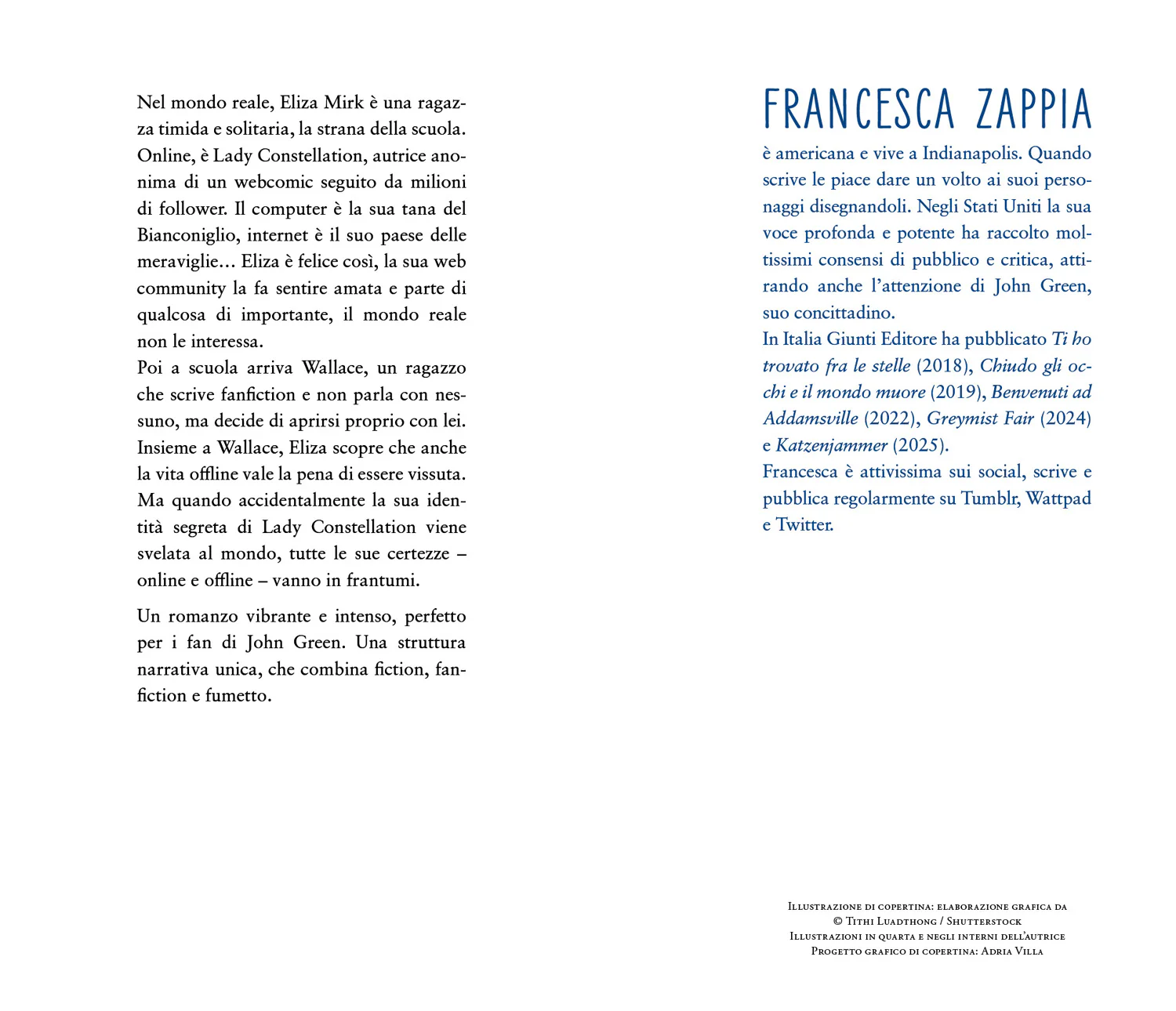 Poi a scuola arriva Wallace, un ragazzo che scrive fanfiction e non parla con nessuno, ma decide di aprirsi proprio con lei. Insieme a Wallace, Eliza scopre che anche la vita offline vale la pena di essere vissuta. Ma quando accidentalmente la sua identità segreta di Lady Constellation viene svelata al mondo, tutte le sue certezze - online e offline - vanno in frantumi.