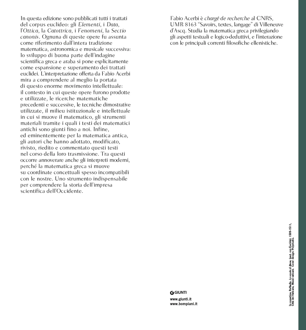 Le opere in greco di Euclide sono il fondamento della geometria occidentale, e pertanto l'elaborazione dei teoremi matematici qui proposta sta anche alla base dell'impresa scientifica dell'Europa. Questo corpus di colossale importanza nacque nell'ambiente filosofico dell'Accademia platonica, grazie a quei pensatori come Teeteto che, accogliendo e rilanciando le istanze del Pitagorismo antico, avevano posto l'aritmetica e la geometria al centro della conoscenza. Gli "Elementi", in particolare, costituirono il manuale di matematica dell'antichità classica e del Medioevo.
